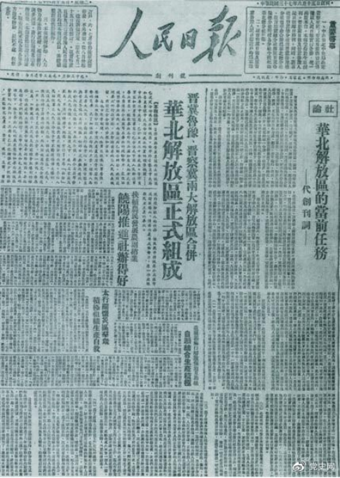 1948年6月15日,晋冀鲁豫解放区《人民日报》与《晋察冀日报》合并后出版的《人民日报》创刊号。